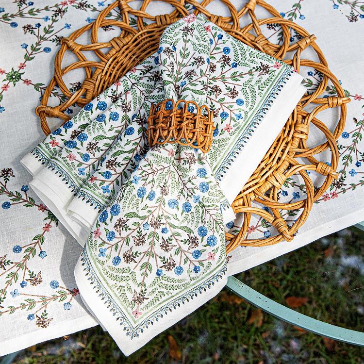 This pure linen napkin is adorned with painterly bursts of intricate leaves and folkloric wildflowers in greens, blues and pinks inspired by the Spanish countryside, with a trim of tiny garlands of blossoms in exquisite detail. Fresh, verdant and a bit whimsical, this enchanting motif mixes and matches like a dream for everyday entertaining and special occasions alike.