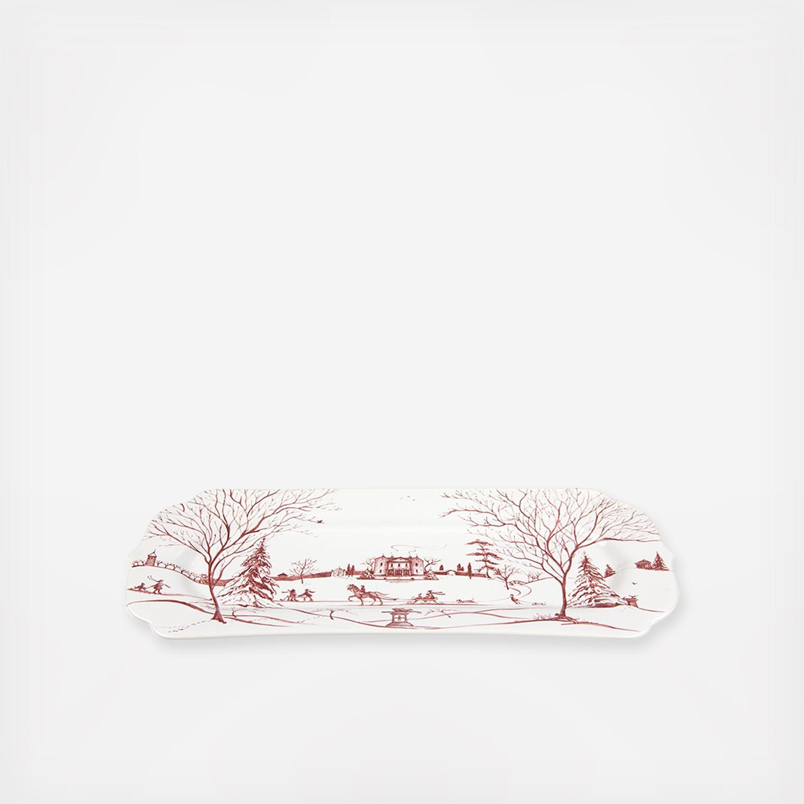 From our Country Estate Collection - From sleigh rides to skating, the scene depicted on our Winter Frolic hostess tray is bustling with wintry activities. Topped with welcoming tendrils of chimney smoke and illustrated in our festive Ruby hue, this Main House serving dish is the consummate gift for the season - or covet for yourself to display appetizers, homemade cookies, and holiday cards. Comes presented in an illustrated box trimmed with a tartan bow and jingle bell for chic and easy gift-giving.