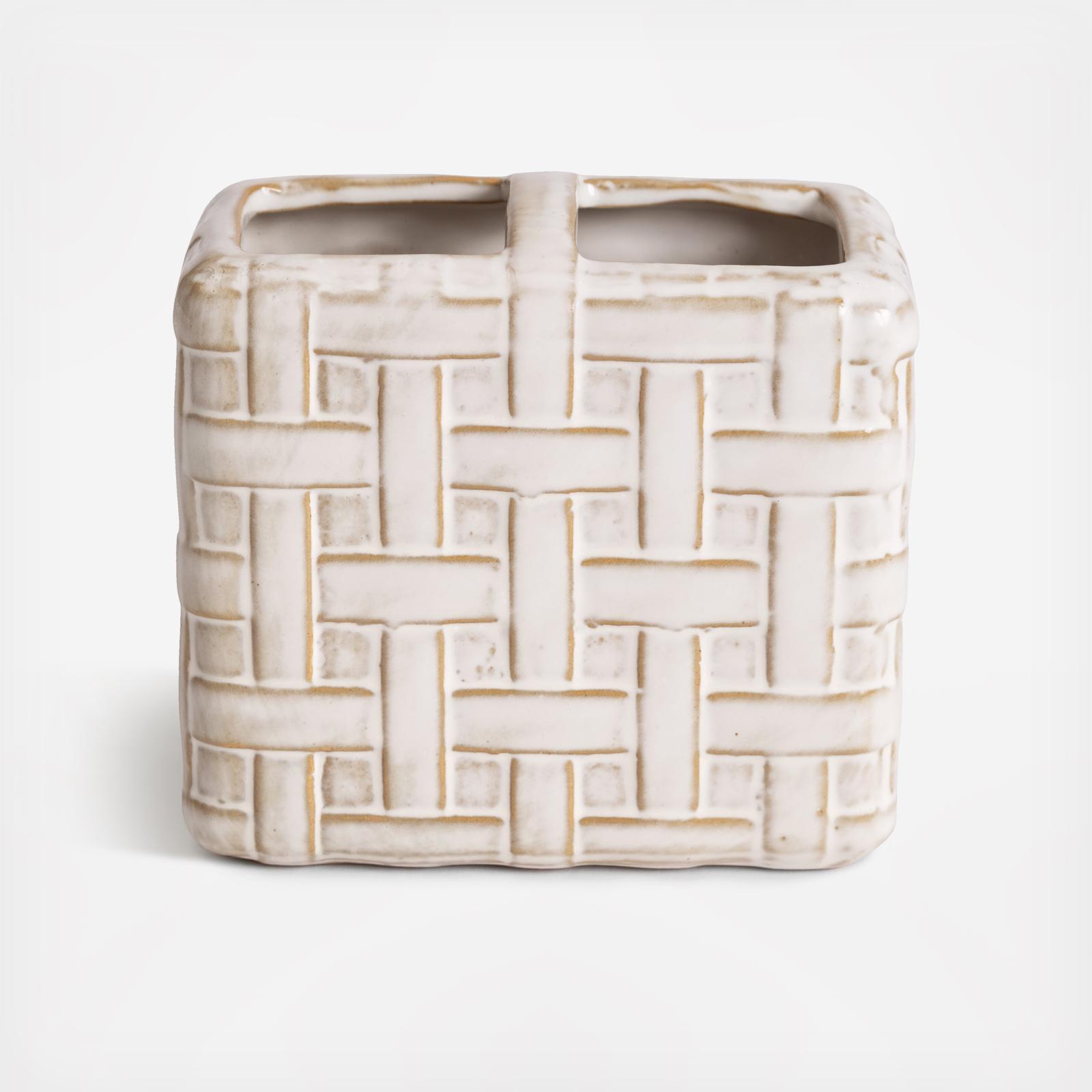 Made from embossed porcelain and inspired by woven raffia palms, this accessory set adds a touch of natural sophistication to your bathroom.