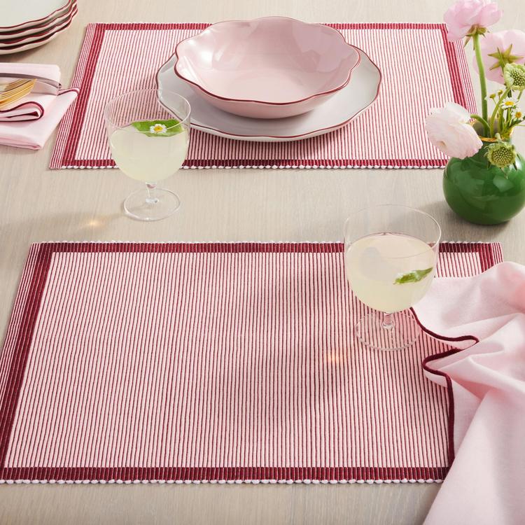 These kate spade garden party placemats bring refined style to your dining table. The woven ribbed cotton placemats feature a classic single-layer border design that coordinates beautifully with kate spade dinnerware collections. each 14"x19" placemat in this 4-pack set is crafted from luxurious 595gsm cotton for durability and sophistication. The reversible design offers versatile styling options for any table setting.
