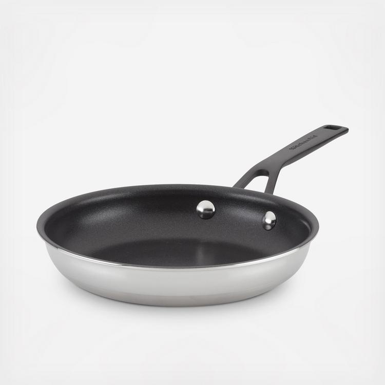 Build layers of flavor with the KitchenAid 5-Ply Clad Stainless Steel Nonstick Frying Pan designed for precision cooking with exceptional base-to-rim heat conduction. Crafted from 5-layers of heat conductive metal throughout, this heavy-gauge induction skillet is built to fuel endless possibilities in the kitchen while providing superior heat retention. Skillet is finished with triple layer nonstick that is strong enough to stand up to daily wear and tear. Unique black stainless steel handles are dual-riveted and provide a sleek table top presentation. Sealed rims prevent corrosion, allowing for frying pan to be truly dishwasher safe. Oven safe to 500°F for versatility, freedom, and creative cooking. This product contains (Este producto contiene) Fluoropolymer, PTFE, FEP, PFA (PFAS). For more information on PFAS or chemicals in this product, visit (Para obtener mas informacion sobre PFAS o productos quimicos en este producto, visite) potsandpans.com/pages/product-disclosures.