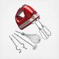 The Kitchen Aid 9-Speed Hand Mixer with Turbo Beater II Accessories offers endless opportunities in one hand-held appliance. It features the powerful but lightweight and quiet DC motor, plus a soft-grip, non-slip handle and a non-tip heel rest. It has the self-cleaning, stainless steel Turbo Beaters designed with an oval shape and no center post to permit thorough mixing of heavy, dense ingredients without clogging. Two dough hooks make easy work mixing yeast bread dough and the blender rod is perfect for creating creamy milk shakes or smoothies. The lockable swivel cord keeps the cord out of the way while in use for either a left or right-handed operator. Plus, the Soft Start electronic control starts slow to minimize flour puff and splatter for less mess.