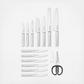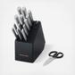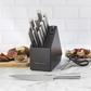 This KitchenAid Gourmet 15-piece Forged kitchen knife set includes all the essential knives needed to perform everyday food prep tasks such as slicing, cutting, chopping, mincing, trimming, and more. Forged blades are crafted using semi-polished, high-carbon imported Japanese steel, hardened and tempered to provide a long-lasting edge for a professional, quality cut every time. These KitchenAid knives feature Eastern-style ergonomic handles that provide optimal control for everyday use. These handles are expertly engineered in a textured stainless steel finish for a comfortable grip, and accented with a polished endcap. The contemporary rubberwood storage block features a built-in sharpener for effortless sharpening and complements any kitchen. KitchenAid knives are top-rack dishwasher safe. To extend the life of your cutlery, hand washing is recommended. Dry immediately.
