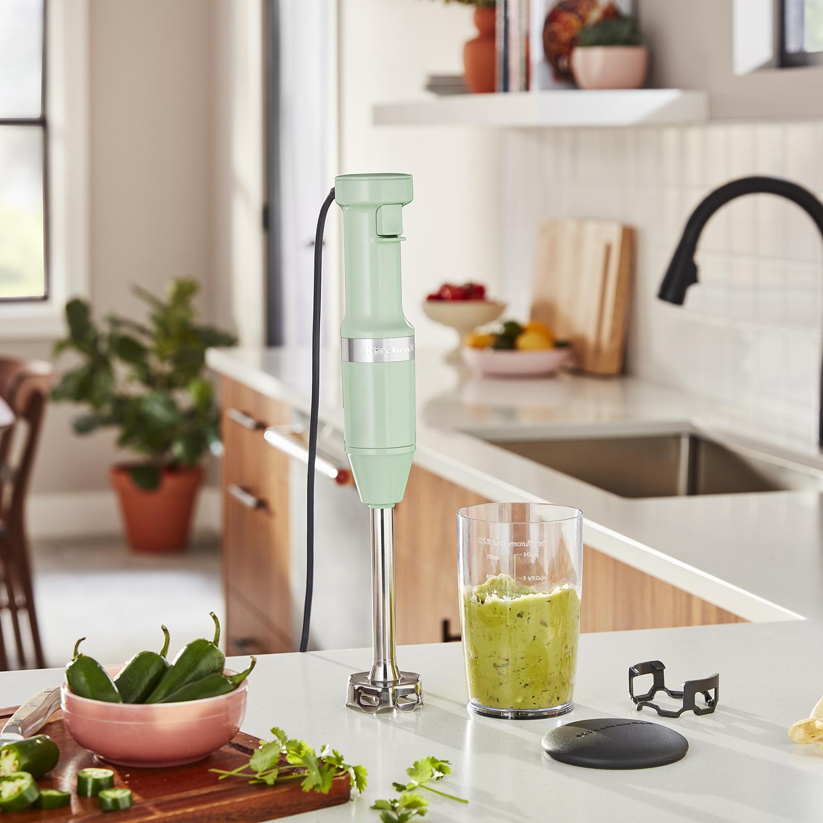 Get the results you want quickly and easily with the KitchenAid corded hand blender. Ideal for blending soups, crushing ice, and making delicious smoothies, the variable-speed trigger switch gives you greater flexibility and control over the recipe. The removable 8-inch blending arm features a 4-point stainless steel blade design for use in either shallow or deep pots and pitchers. Plus, it has a removable pan guard to help protect cookware. The 3-cup BPA-free blending jar with lid is great for individual blending jobs, and can be used to serve direct or store your blended creation for a later use.