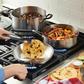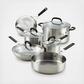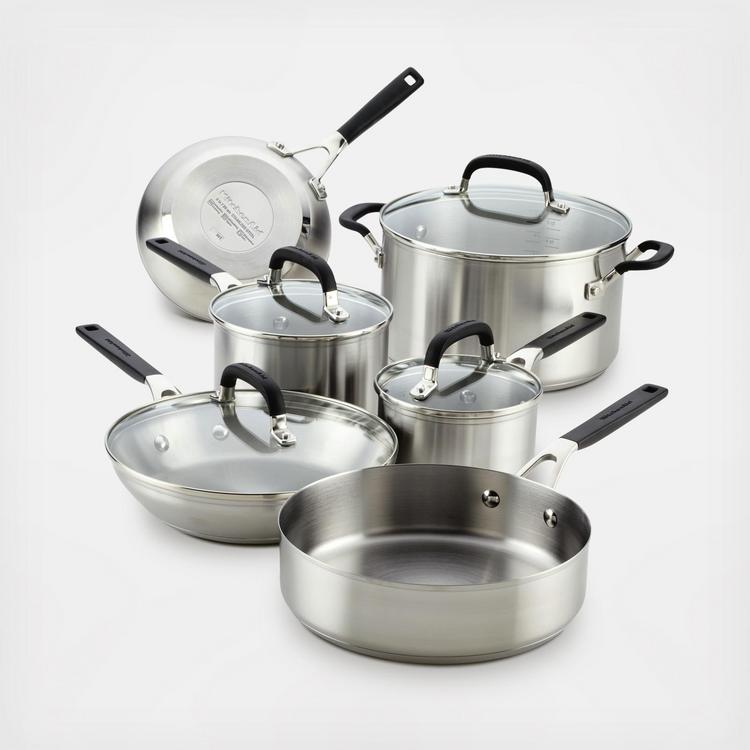 Ignite kitchen creativity and experience rich flavor with the KitchenAid Stainless Steel 10-Piece Cookware Set. Crafted from durable stainless steel with a layer of heat-conductive aluminum in the base, these pots and pans are designed to heat quickly and evenly to grill, boil, and simmer with ease. Saucepans and stockpot feature etched measuring marks to add measured ingredients. Stainless steel handles have been finished with silicone grips for a cooler handle while cooking, when compared to traditional stainless steel handles, while tempered glass lids seal in heat and flavor. Pots and pans are dishwasher safe for quick, easy cleanup and oven safe to 400°F (350°F with lids) for making a wide range of delicious recipes.