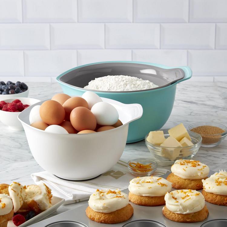 These Mixing Bowls are a kitchen essential. They each feature a nonslip base and easy-pour spouts to reduce the chance of spills and mess. The bowls nest together when not in use for easy storage. Dishwasher safe. Lifetime Limited Warranty.