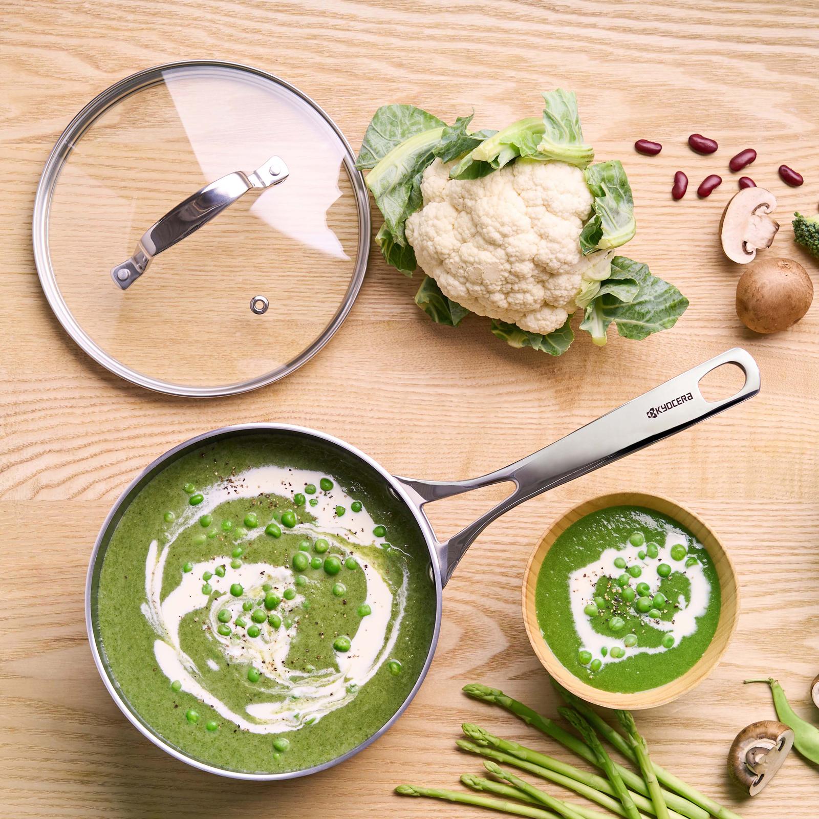 Kyocera ceramic-coated nonstick cookware is the healthier, more environmentally friendly choice for your kitchen. Free of PTFE, PFOA, lead, cadmium, fluorine, and heavy metals, this cookware is easy to clean, provides even heat distribution, and is compatible with all heat sources.