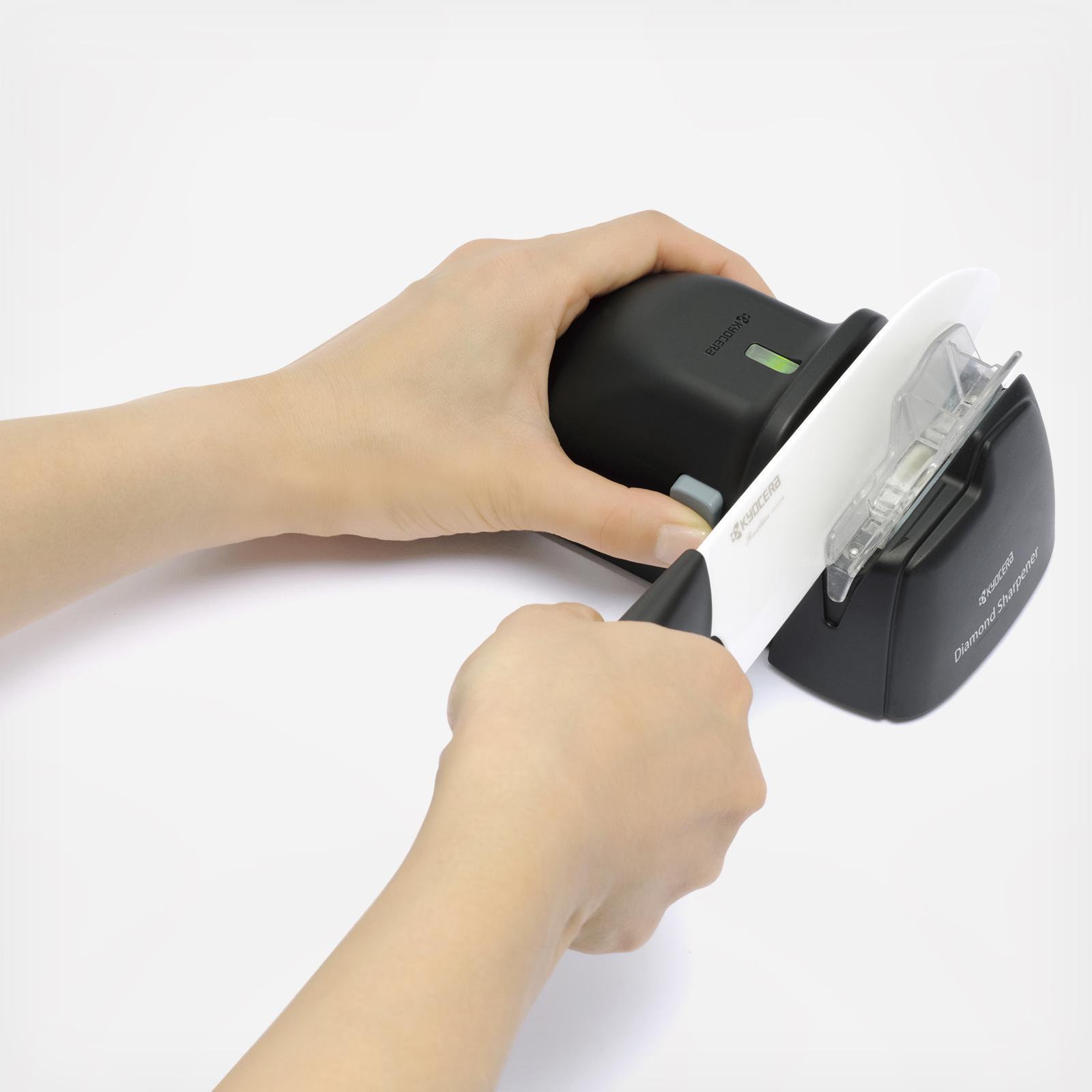 Kyocera’s battery powered diamond wheel knife sharpener is the perfect solution for quick, powerful and easy at-home sharpening of both Kyocera ceramic and steel knives. The diamond grinding wheel can remove ceramic chips up to .5mm deep refreshing a dull ceramic blade back to a smooth sharp edge. A convenient user-friendly knife guide slot, as well as an assist roller system provides precision controlled sharpening of the blade. Grinding dust is contained in a safety covered grinding compartment. Diamond Grinding Stone is not replaceable.