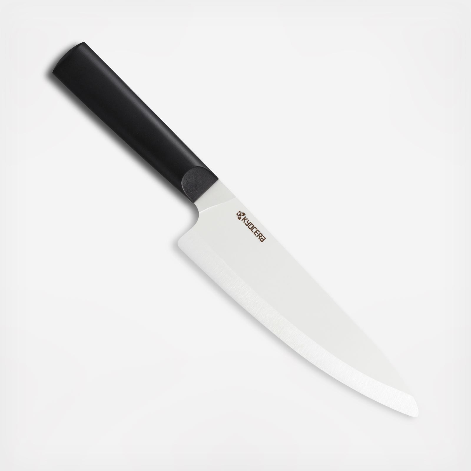 Kyocera's INNOVATIONwhite knives feature a seamless handle design with a better grip for different cutting techniques. The handle gradually thins to the blade, with a tight seam for finger grip. The circular underside of the handle and slightly thicker ends prevent the knife from dropping when hands are wet. The knives weigh half as much as their metal counterparts, making them easy to use and control, which helps improve your cutting skills in home cooking. The 7 inch Chefs Knife is shaped to handle any rocking-style cutting for heavy, repetitive prep tasks.