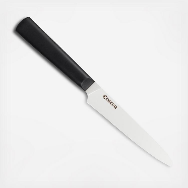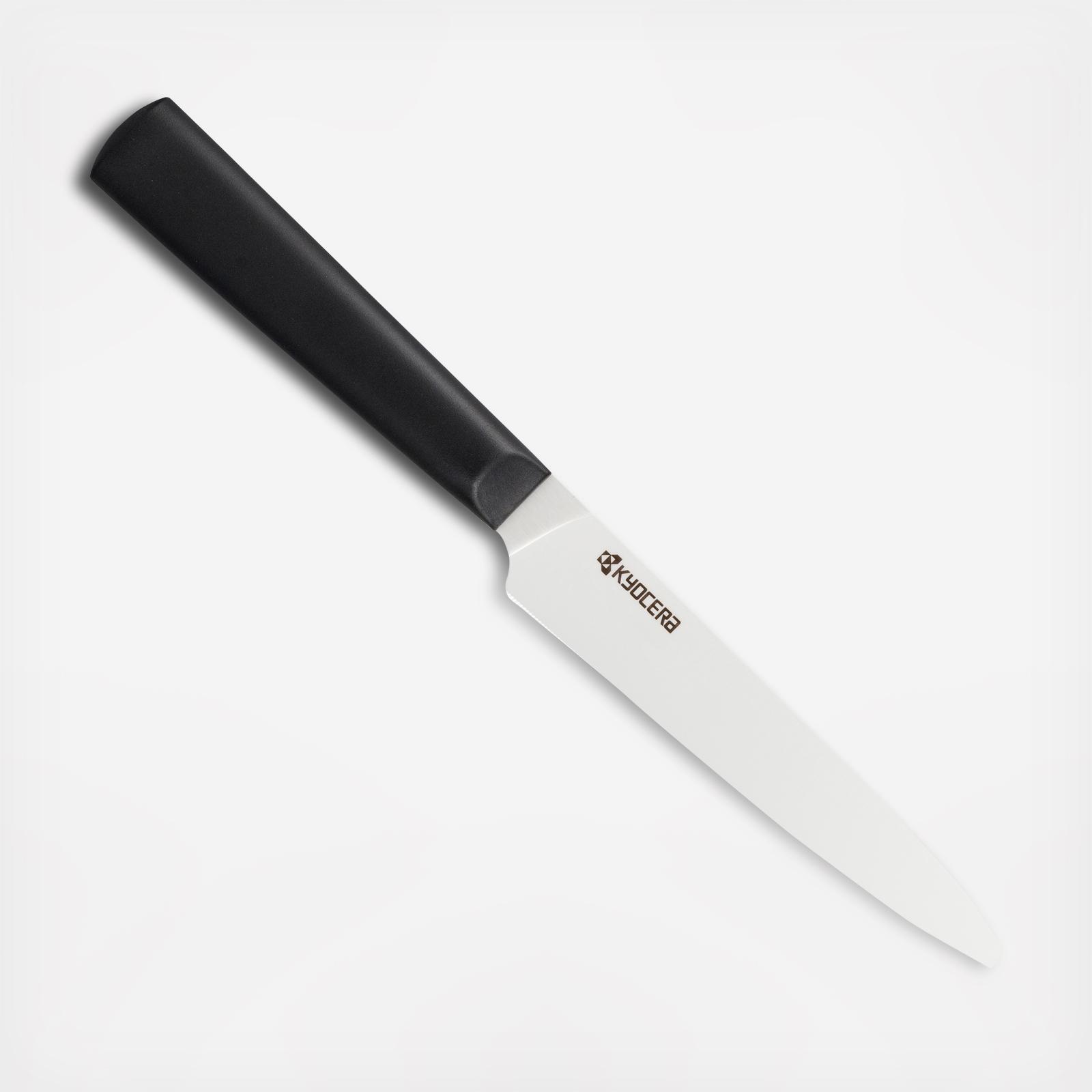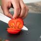 Kyocera's INNOVATIONwhite knives feature a seamless handle design with a better grip for different cutting techniques. The handle gradually thins to the blade, with a tight seam for finger grip. The circular underside of the handle and slightly thicker ends prevent the knife from dropping when hands are wet. The knives weigh half as much as their metal counterparts, making them easy to use and control that helps improve your cutting skills in home cooking. The 5 inch micro-serrated tomato knife is a long-lasting, ultra-sharp knife with a non-slip, ergonomic handle. The patented blade easily pierces through tougher skins of fruits, vegetables, or bread.