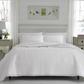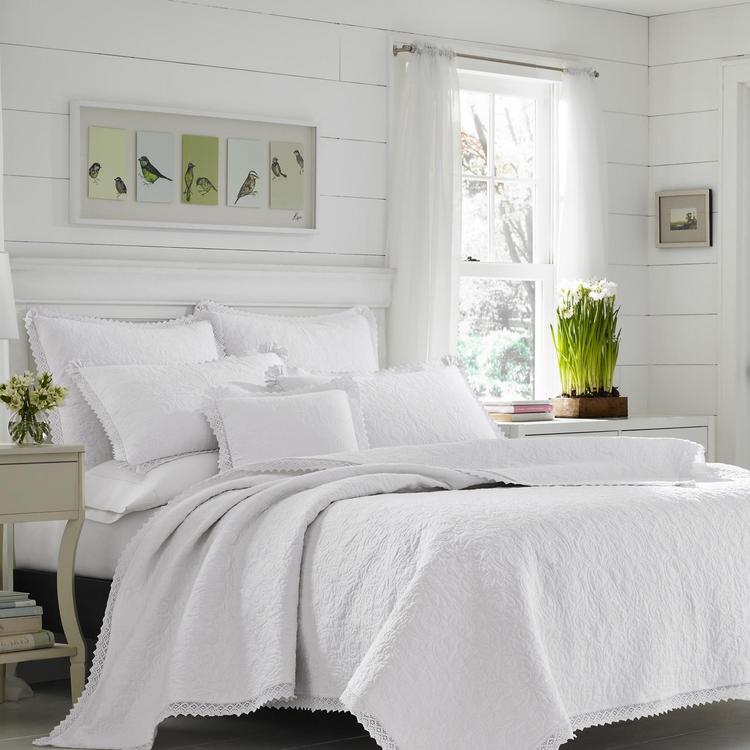 This romantic white cotton quilt ensemble exudes comfort, calm, and luxury. Quilted in a beautifully detailed floral scrollwork design, the quilt and shams are edged in a cotton crocheted lace with a ruffled gather at the corners. The cotton quilt is pre-washed for additional softness.