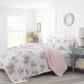 No matter the season, beautiful blooms are always a good choice for decorating and this lovely floral print will add springtime cheer to your bedroom all year long. Blush tones mixed with sage greens create a soft and inviting palette on a clean white background. The quilt reverses to a small-scale leaf print in blush and white that also binds the edges of the quilt for a clean tailored finish. An allover vermicelli quilt stitch adds depth and textural interest to this fresh floral ensemble. 100% pre-washed cotton quilt set has cotton/poly fill. Included shams feature an easy overlap closure.