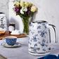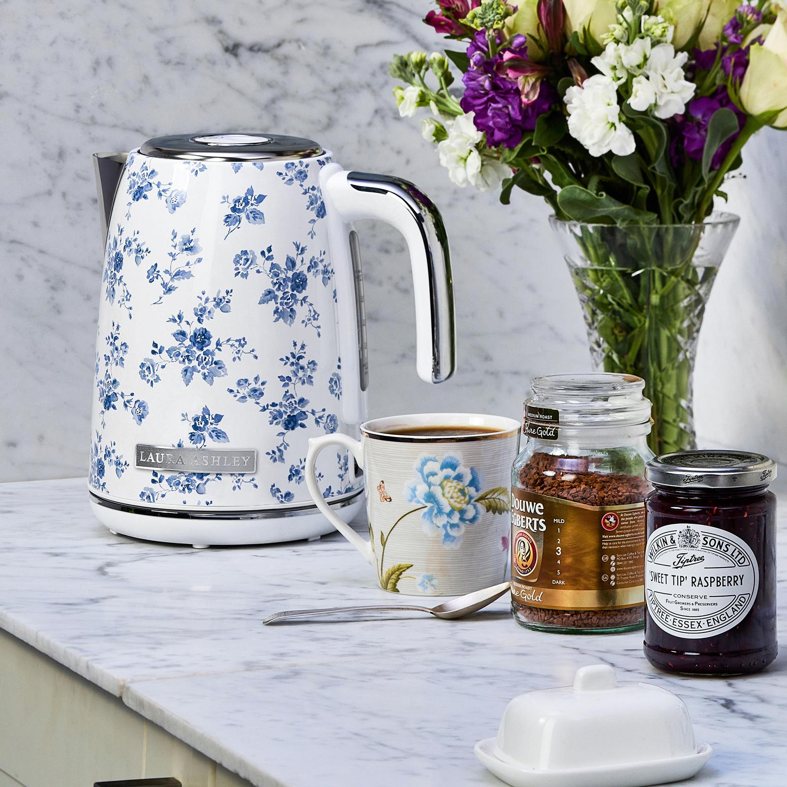 If you're looking for an easy way to make a hot, delicious cup of tea or the beverage of your choice, look no further than the beautiful VQ Laura Ashley Cordless Electric Jug Kettle! With a capacity of up to seven cups. A perfect match for a rich-tasting coffee, delicious warm hot chocolate, a classic mocha, and much more. Your Laura Ashley Jug Kettle features the classic and chic hand-applied China Rose print. Each kettle is hand decorated and finished with a high-grade gloss UV coating to ensure it looks pristine day in and day out. Including a high-quality chrome trim complementing the printed body design. This rapid-boil electric kettle has several safety functions. It has a dry boil feature that automatically shuts down the power if no water is inside and overheat protection with a concealed heating element. It helps conserve energy, saving you money, and also the environment with its cup capacity monitor. It has a removable anti-scale filter and a flip-top cool touch lid for safe usage. A tactile on/off rocker switch with a light indicator. Fast boiling capability and a water viewing window and indicator. The anti-slip, sturdy handle stays cool, with plenty of holding space and non-slip feet. It is super convenient and looks gorgeous in your kitchen or home office.