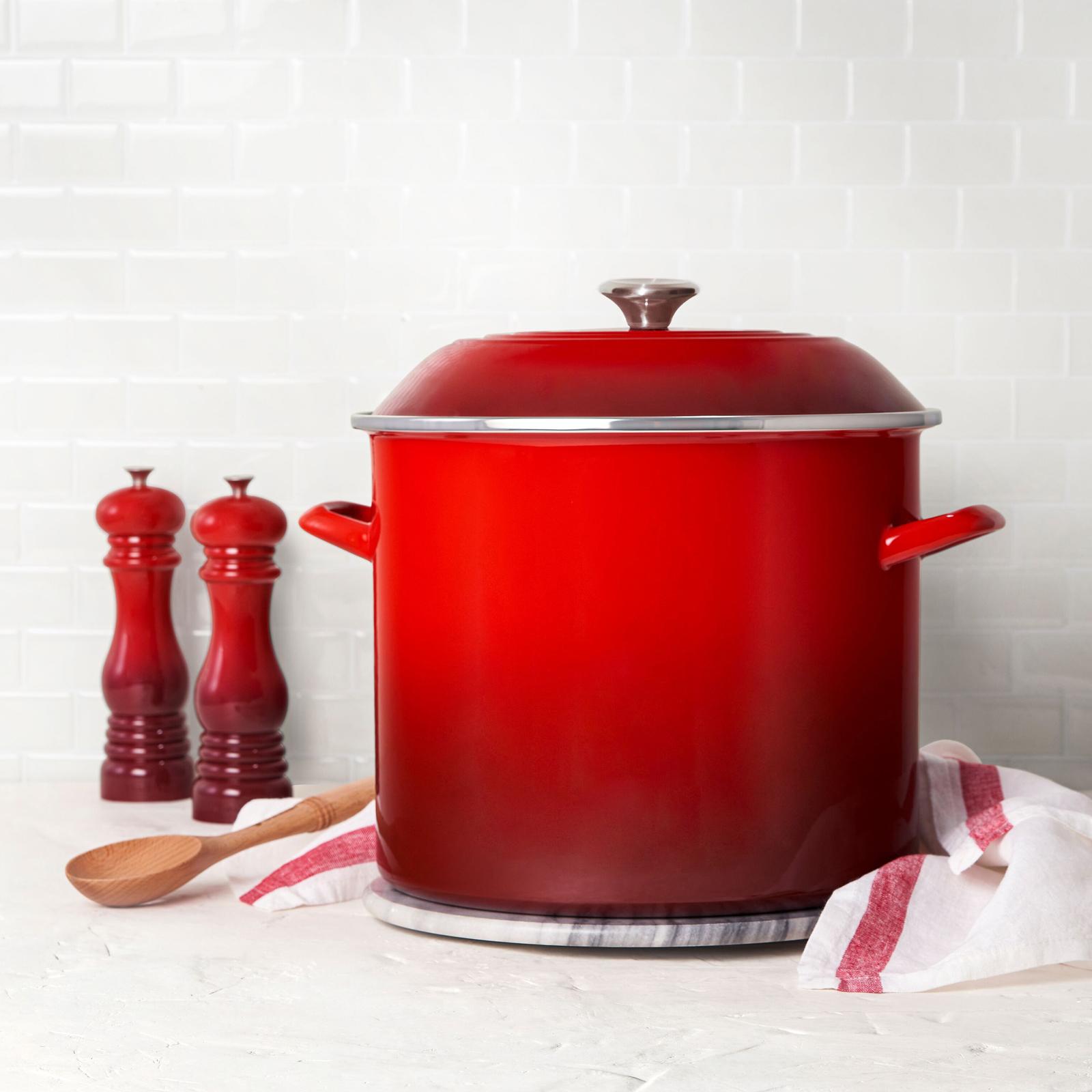 Tall straight sides and large capacity make enamel on steel Stockpots ideal for soups, stocks, cooking pasta and boiling seafood. Available in a range of convenient sizes, they deliver our fastest-heating performance of premium carbon steel glazed in our beautiful palette of colors. Lightweight and durable, carbon steel rapidly brings water to a boil to speed up prep and cooking and retains heat to keep food and liquids warm. The easy to clean colorful porcelain enamel coating is non-reactive and resistant to stains and flavors, making enamel on steel stockpots ideal for everyday use.