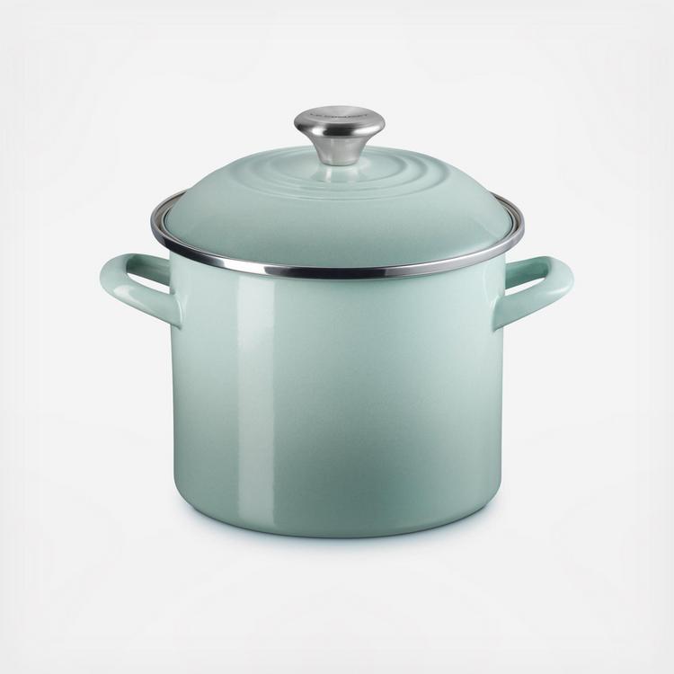 Tall straight sides and large capacity make enamel on steel Stockpots ideal for soups, stocks, cooking pasta and boiling seafood. Available in a range of convenient sizes, they deliver our fastest-heating performance of premium carbon steel glazed in our beautiful palette of colors. Lightweight and durable, carbon steel rapidly brings water to a boil to speed up prep and cooking and retains heat to keep food and liquids warm. The easy to clean colorful porcelain enamel coating is non-reactive and resistant to stains and flavors, making enamel on steel stockpots ideal for everyday use.