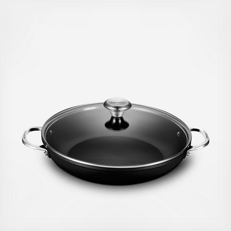 The toughened nonstick braiser is uniquely designed for maximum performance, transforming tough cuts of meat and hearty vegetables into tender, flavorful dishes. Food is first seared over high heat, then finished slowly in a flavorful liquid. The wide base of the braiser allows ingredients to be placed in a single layer for proper searing; once liquid is added, the tempered glass lid circulates steam to lock in moisture and flavor.