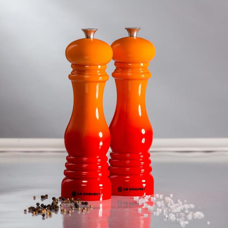 These salt mills combine classic form and modern technology with their iconic colors. The ceramic grinder is strong enough to crack peppercorns and corrosion-resistant for grinding salt. Adjust the grind setting with a turn of the knob-clockwise for a finer ground and counterclockwise for a coarser grind.