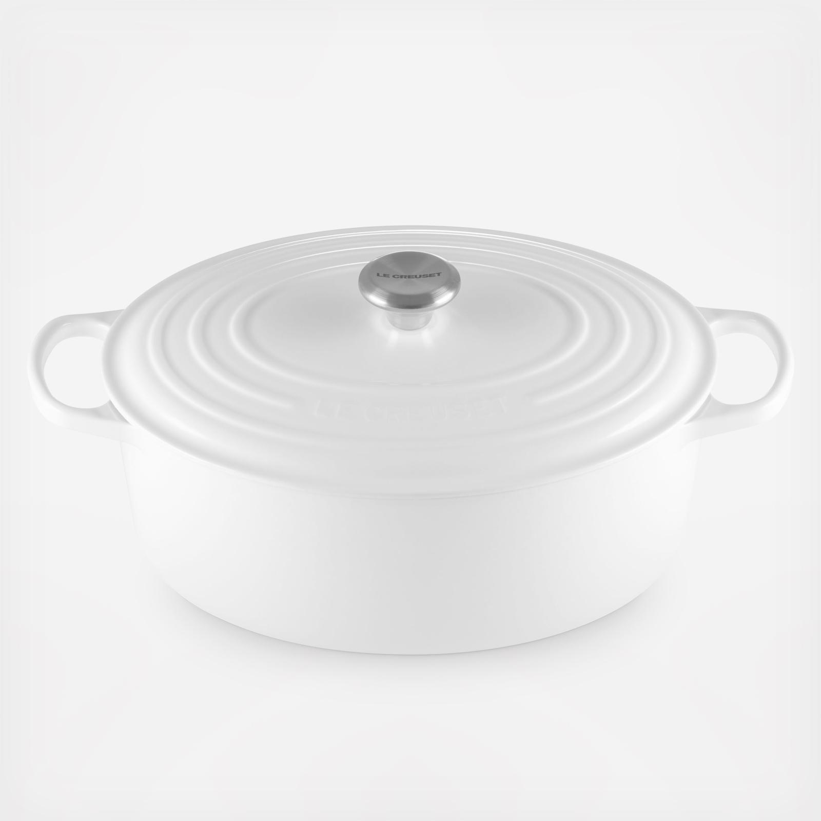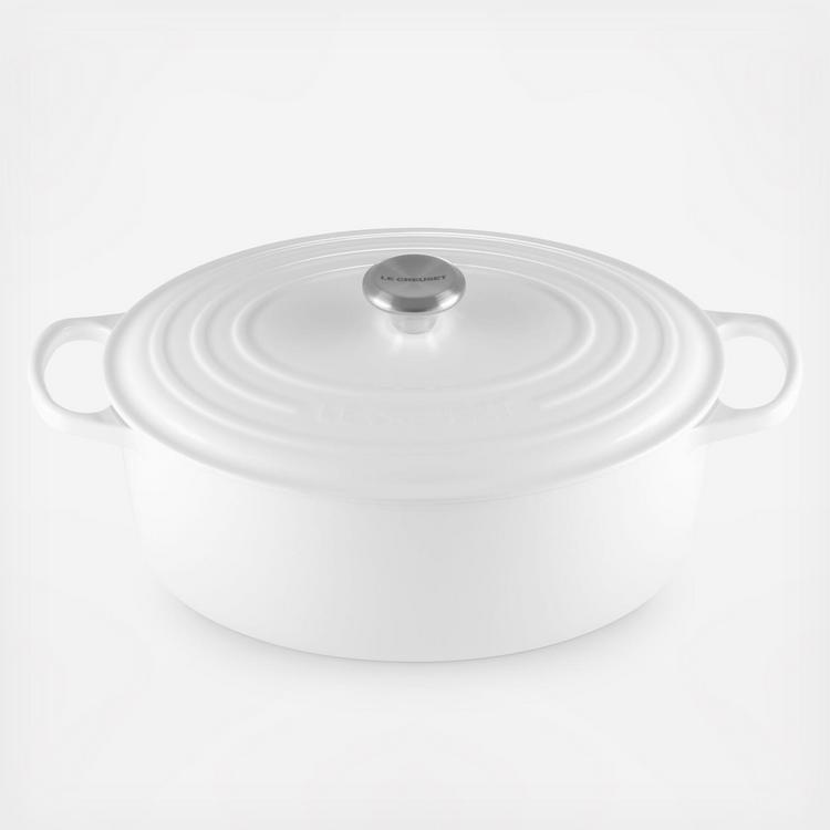 The iconic Le Creuset Dutch oven is indispensable in the kitchens of home cooks and professional chefs alike. Expertly crafted from enameled cast iron, the everyday versatility of the Dutch oven makes it ideal for everything from slow-cooking and braising to roasting, baking, frying and more. The oval shape is particularly suited for larger cuts of meat, whole chickens and for baking oval-shaped loaves of bread. Individually crafted by French artisans from the finest quality materials since 1925, the Le Creuset Dutch oven is beloved for its perfected design and exceptional heat retention that locks in moisture and flavor to produce superior results from stove to oven to table. Designed for generations of durability, the easy-to-clean vibrant porcelain enamel requires no seasoning, minimizes sticking and is dishwasher-safe.