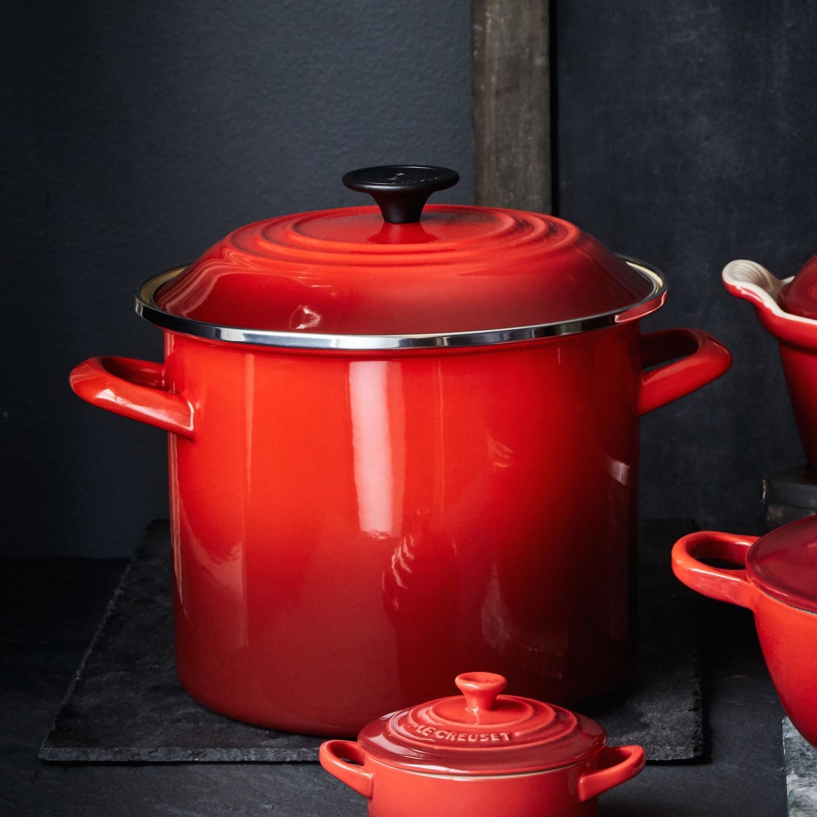 Designed to function efficiently on a full range of heat sources, enamel-on-steel stockpots are not only resistant to wear and damage, but also versatile enough for any type of stovetop, old or new. Their high-profile design limits evaporation while forcing liquids to bubble through all layers of ingredients, infusing the entire dish with flavor during cooking. Le Creuset stockpots are finished in the same bold palette of signature colors as Le Creuset enameled cast iron, making them perfectly stylish complements to any combination of cookware.