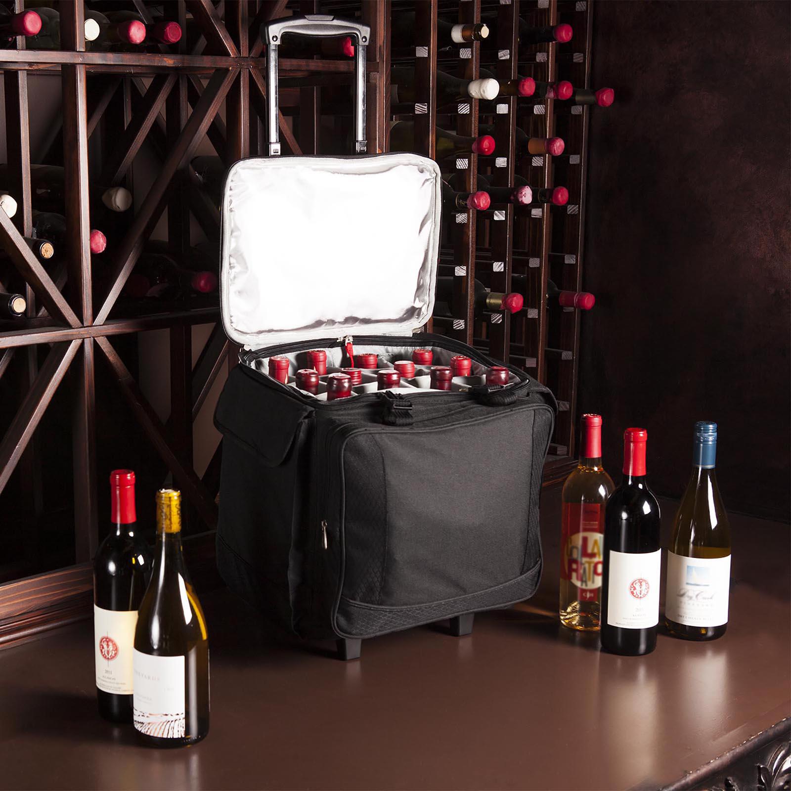 Roll hard to the picnic party with the Bodega Wine & Cooler Tote, a rolling beverage cooler with a push-button-release telescoping handle. This rolling cooler features a spacious water-resistant-lined interior that holds 12 wine bottles or 40 12oz cans and the three exterior pockets are large enough to hold 3-ring binders (tasting notes?) and other personal effects. Because convenience is cool.