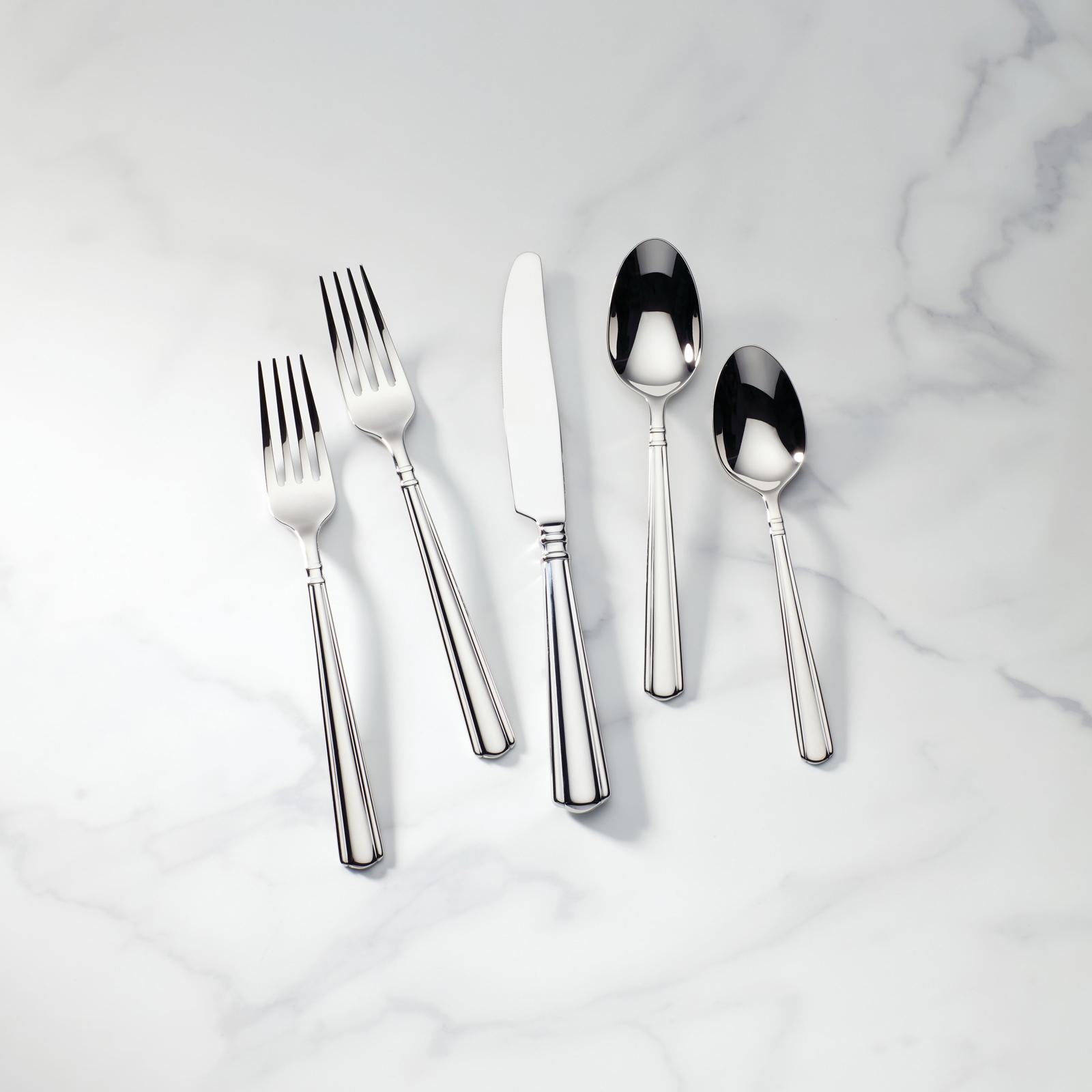 The Amber Hill flatware set features simple lines along the handle that end in an elegant scallop, creating a curtained effect. Crafted from brilliant 18/10 stainless steel, this high quality flatware set is both durable and dishwasher safe, making it ideal for everyday use. This large set has everything you need in one and can be used for both casual and formal occasions.