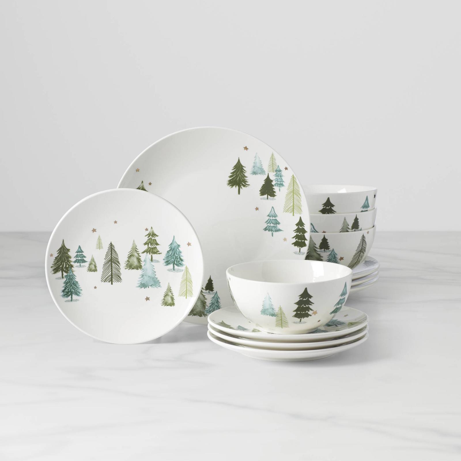 This Balsam Lane dinnerware set brings instant charm to your table with its winter scene of lush trees and golden stars. It's a delightful collection for the winter season!