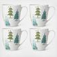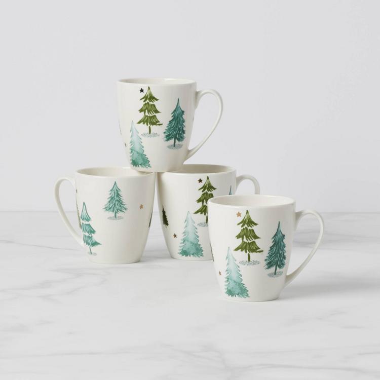 This set of four white ceramic mugs features charming painted pine trees and glittering metallic stars, making the set ideal for a cup of hot tea with a friend in the evening.