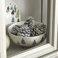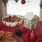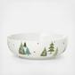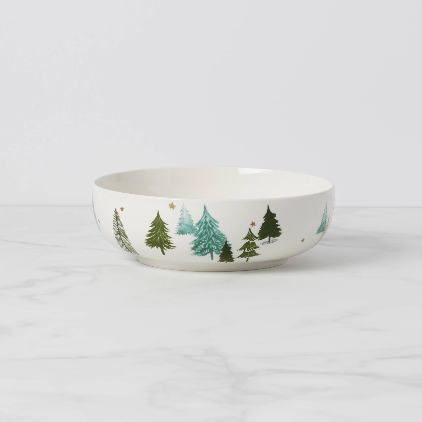 Crafted of porcelain, this serving bowl includes charming evergreen trees and painted metallic stars that shimmer in candlelight. The bowl is part of the Balsam Lane Collection.