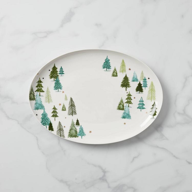 Part of the Balsam Lane Collection, this porcelain serving platter features whimsical pine trees surrounded by the subtle metallic sheen of stars.