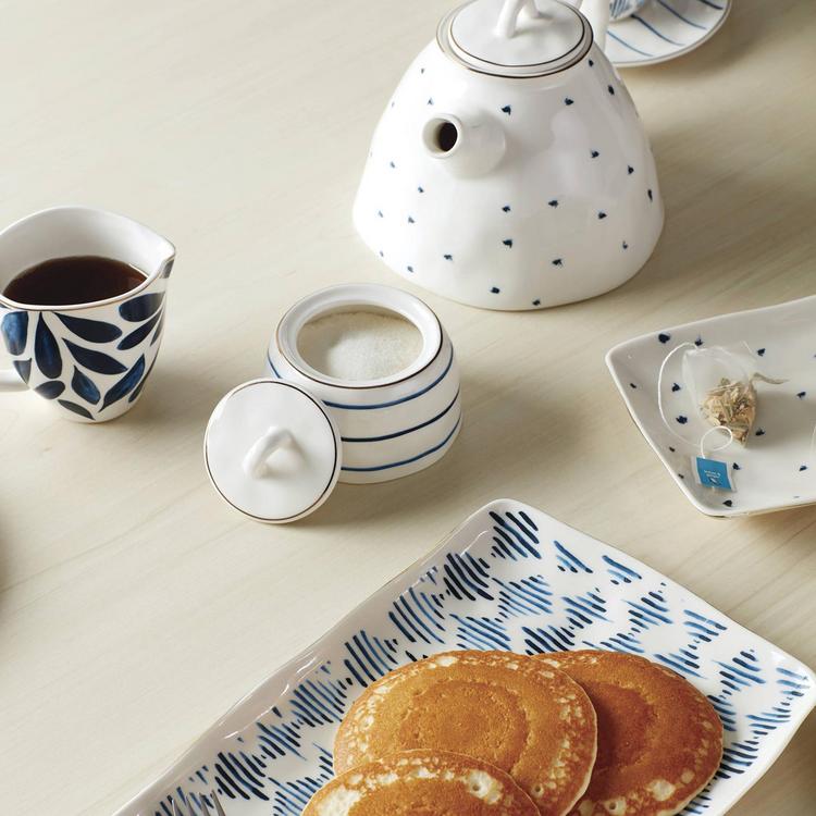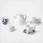 Enjoy tea for two with this charming set from our popular Blue Bay collection! Mix-and-match patterns of dots, stripes, ikats and leaves make up this sweet porcelain set, while organic, touchable textures give it a unique finish. Complete with a thin band of microwave-safe gold for a luxe touch.