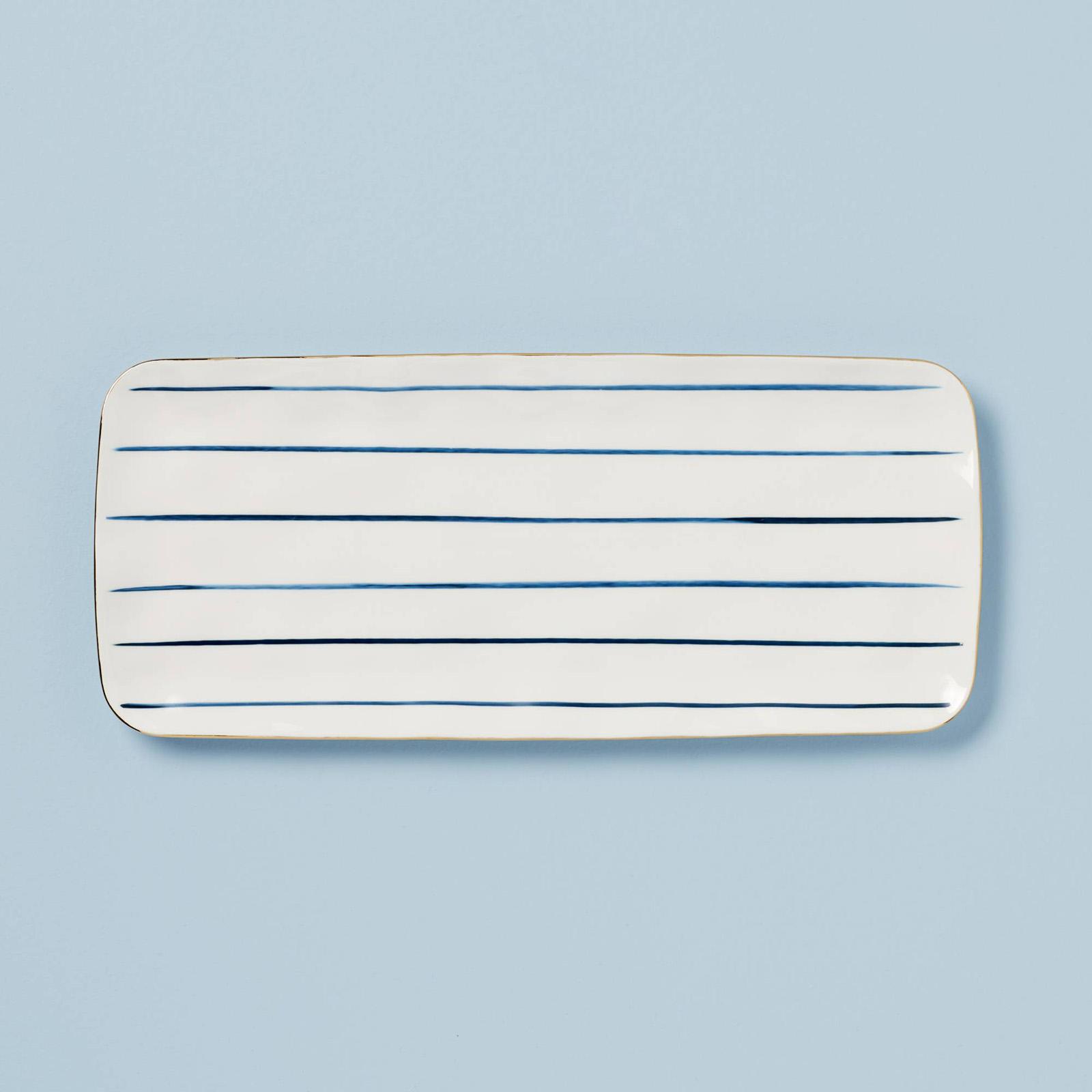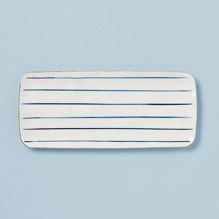 The Blue Bay hors d'oeuvre tray is ideal for serving delicious desserts, and can also be used as a server for smaller side bowls for a charming effect. Featuring a delicate stripe pattern and thin gold accent, this tray is perfect for any dessert spread.