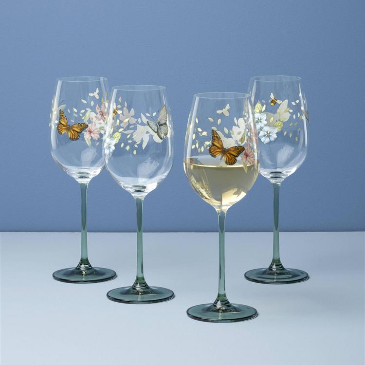 Lively butterflies and bees zip about vibrant foliage on these Butterfly Meadow wine glasses. The trademark design features elegant florals and friendlies fluttering in the wind, ready to fly in and turn any party into a garden party!