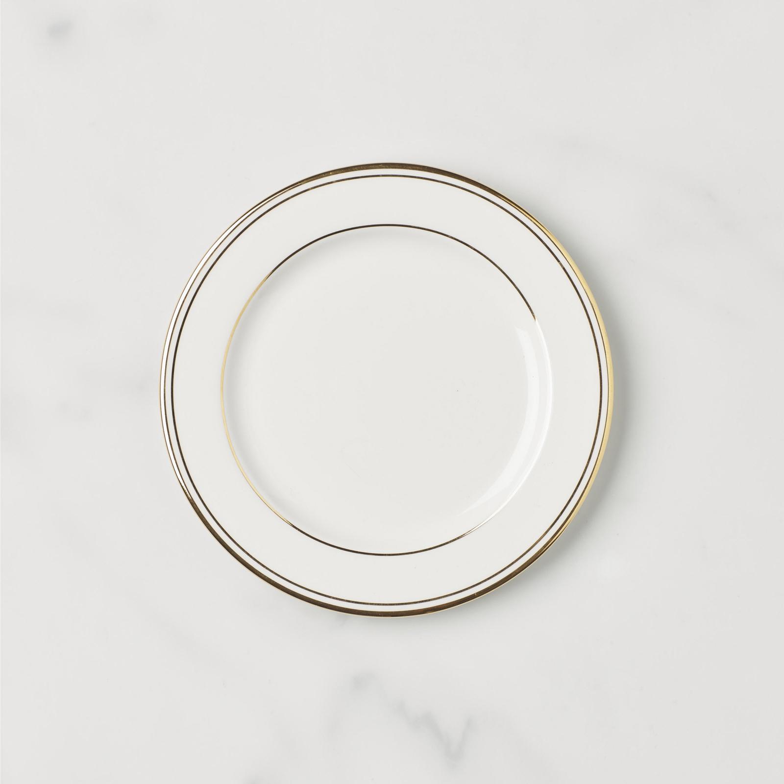 A classic pattern is rediscovered in the Federal Gold Bread & Butter Plate. Bands of shimmering 24 karat gold adorn bone china, radiating both grace and luxury. This dinnerware is a timeless choice for every table.