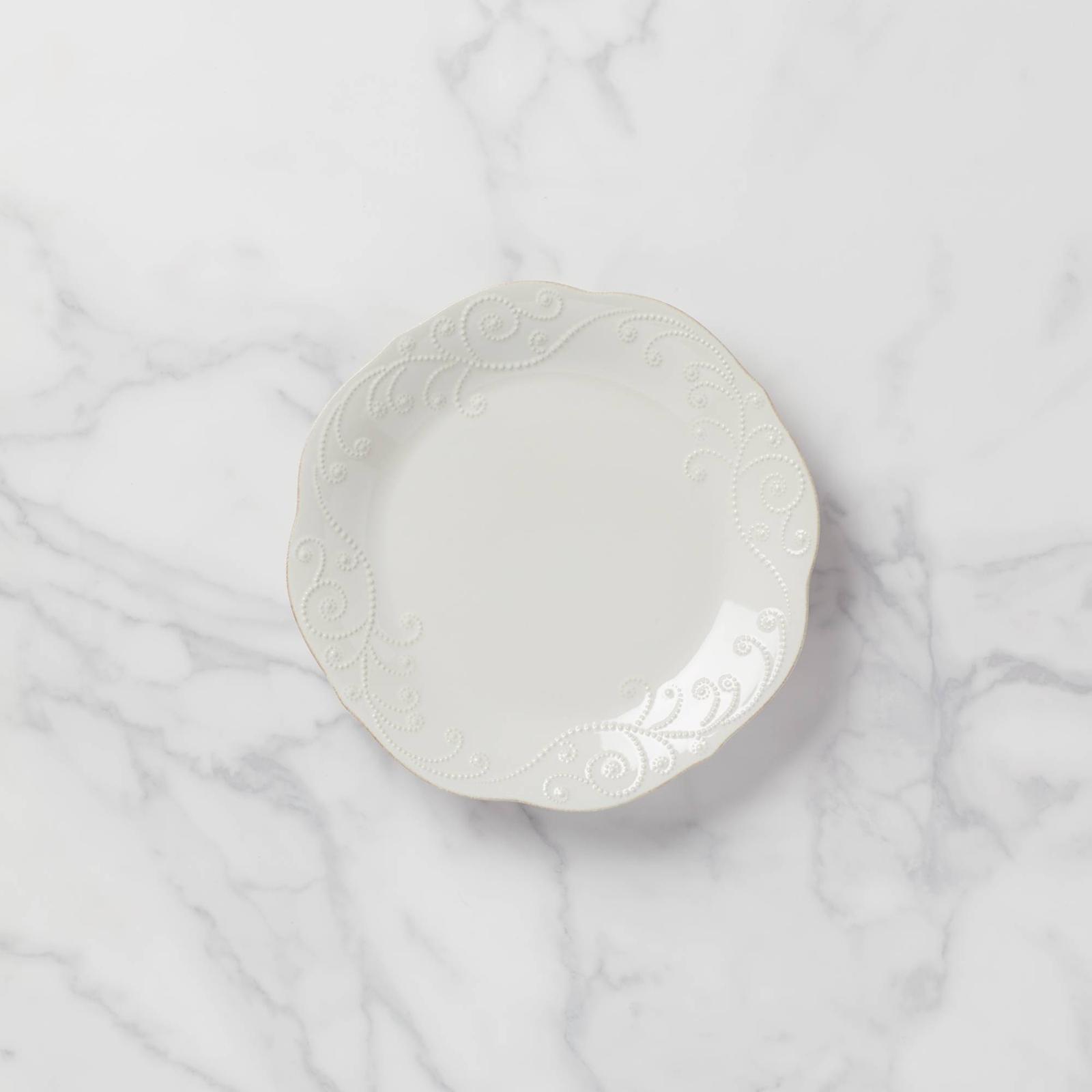 Distinguished by a beaded motif, the French Perle Ice Dinner Plate is reminiscent of French country dinnerware. A tea-stain distressed finish around the plate's beaded edge beautifully complements the plate's soft hue.