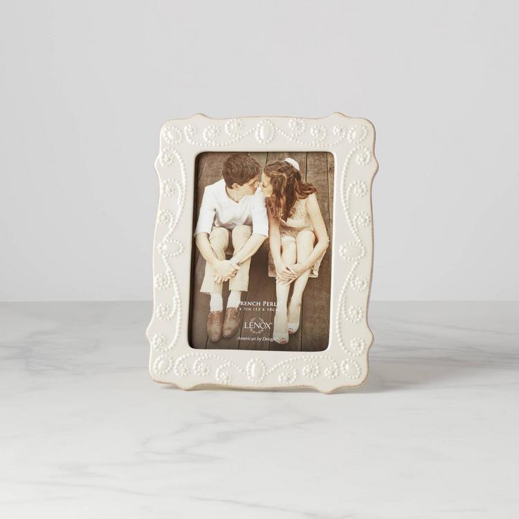 Inspired by the popular French Perle Dinnerware design motif,the French Perle 5 x 7 Frame is decorated with a delicate border of raised beads around a beautiful scalloped edge. Crafted in shimmering white stoneware, this lovely frame matches any decor. Makes a wonderful gift.