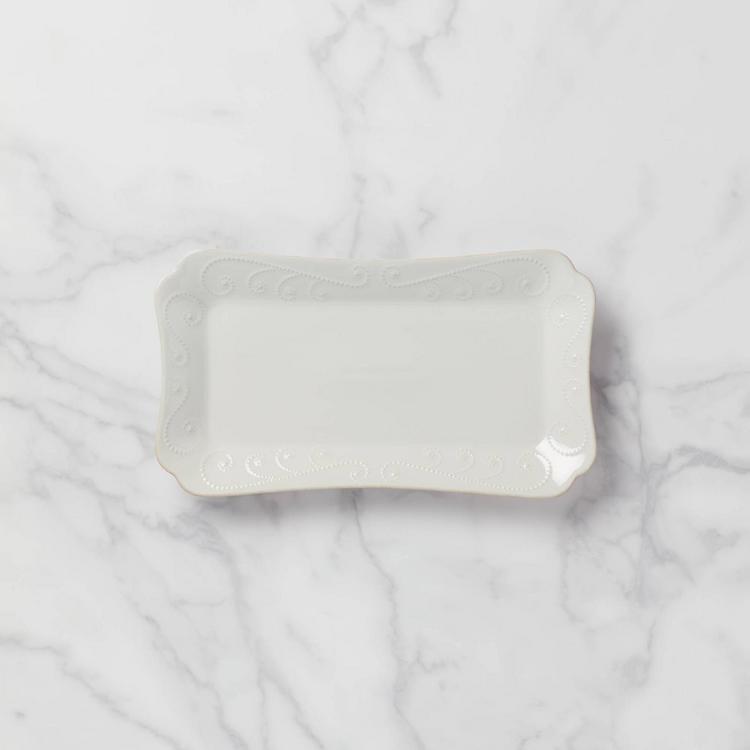 Our French Perle Hors D'oeuvres Tray has a vintage French country dinnerware look, with its tea-stain trim and sculpted embroidery motif. It's a classic style, and one that will complement any table decor, from traditional to contemporary.