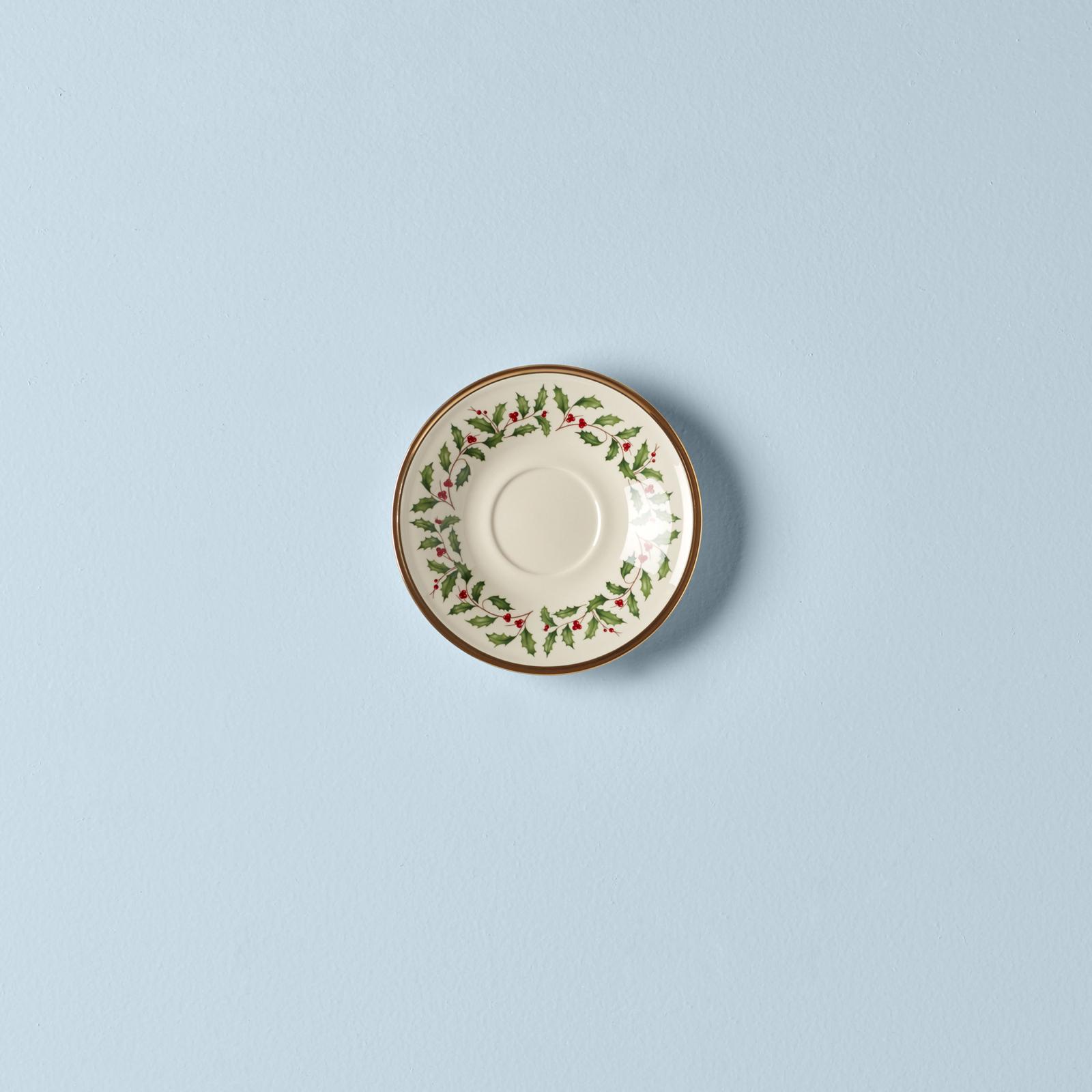 Part of the time-honored Holiday Dinnerware Collection, holly and berry motif adorns the surface of the Holiday Tea Saucer. Crafted from durable ivory bone china with rich 24-karat gold trim, for an opulent holiday themed tableware addition.