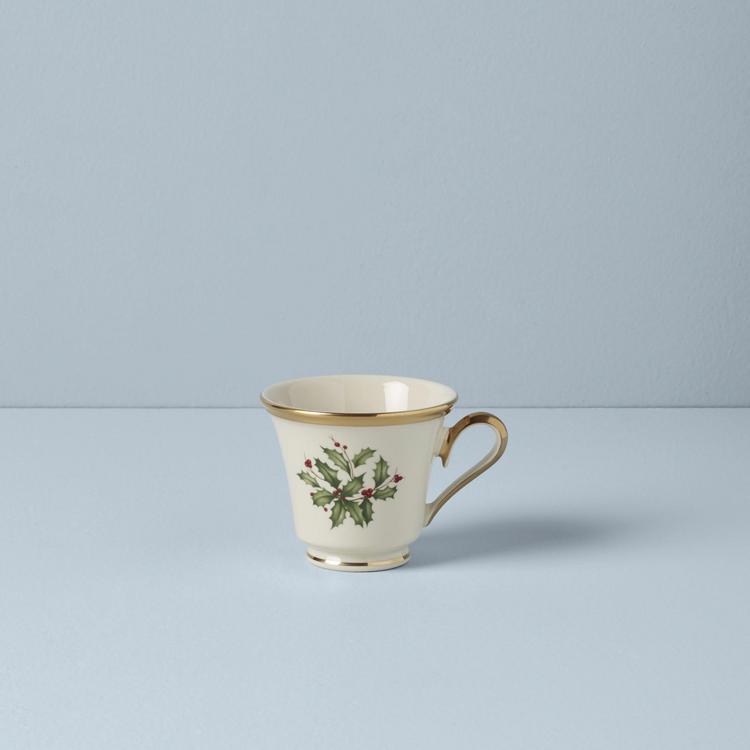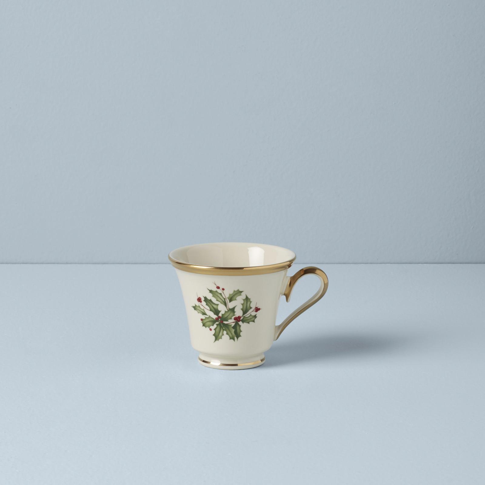 Part of the time-honored Holiday Dinnerware Collection, holly and berry motif adorns the surface of the Holiday Teacup. Crafted from durable ivory bone china with rich 24-karat gold trim, for an opulent holiday themed tableware addition.