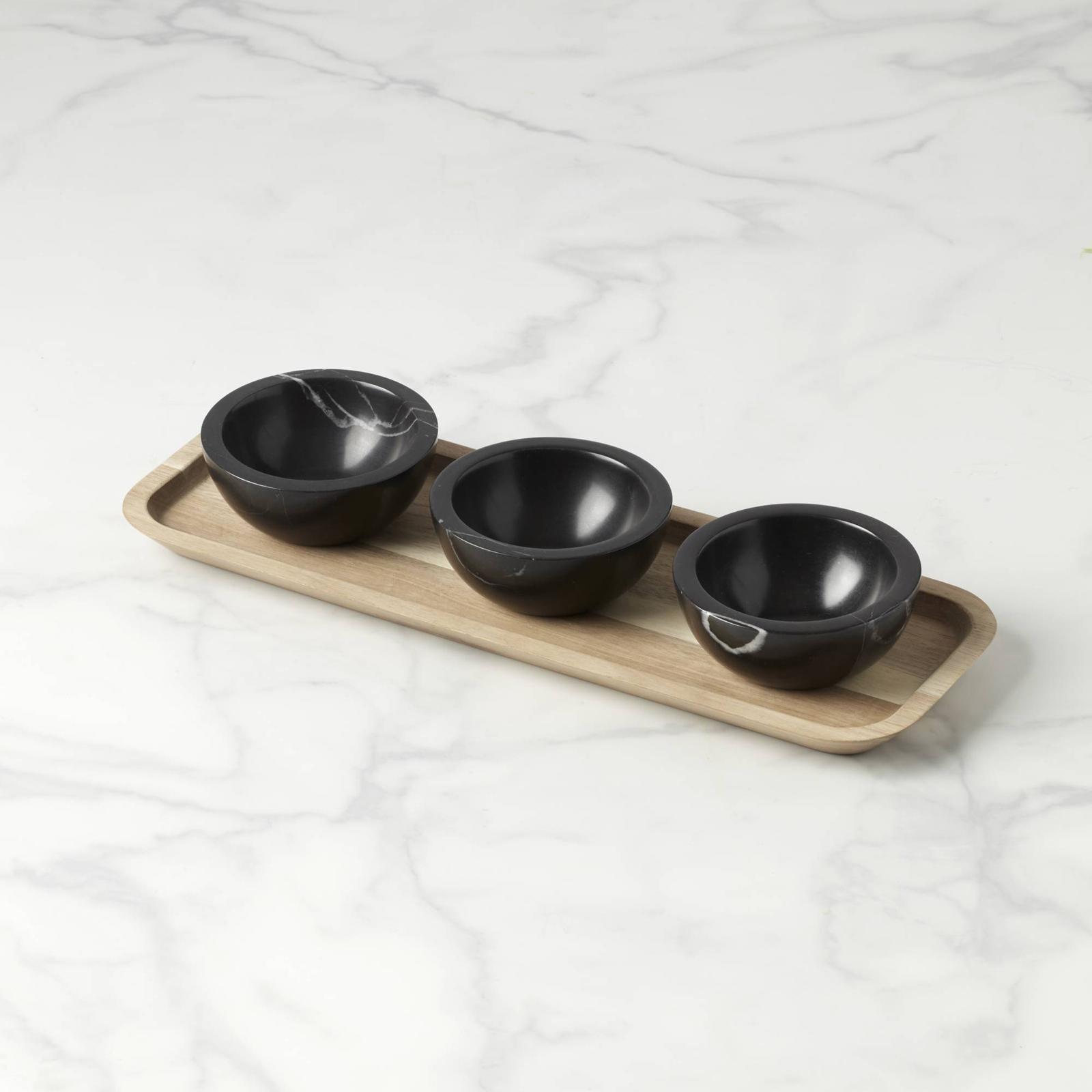 Simple meets sublime in these LX Collective 3-Dip Bowl Set with Tray. Juxtaposing modern marble bowls with an earthier wooden tray. The set comes together with a timeless appeal you'll appreciate for all your events.