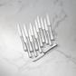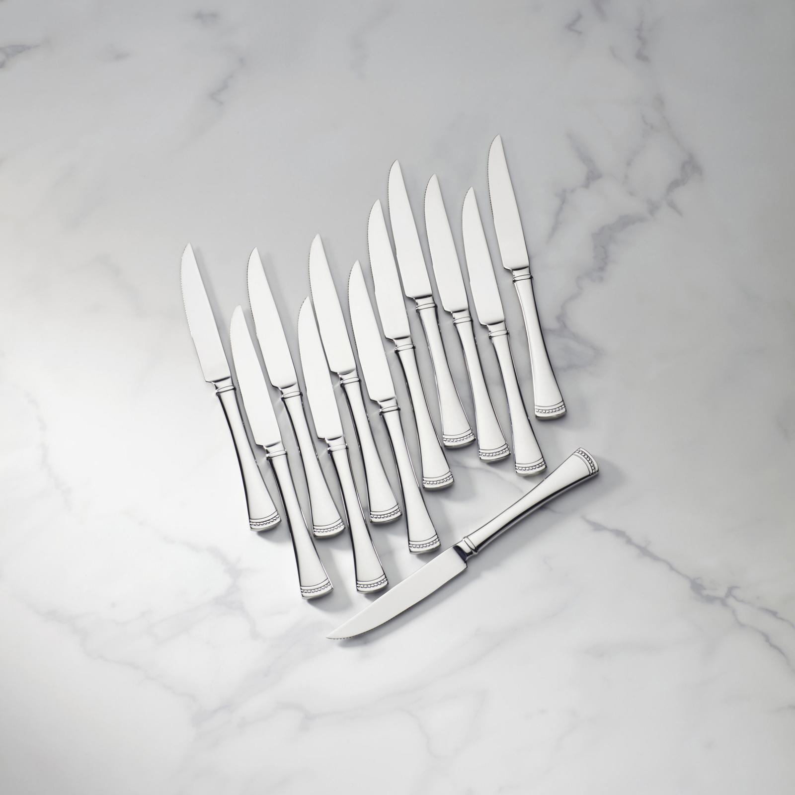 The Portola pattern features flared handles with a beaded channel at each base. Crafted from brilliant 18/10 stainless steel, this high quality steak knife set is both durable and dishwasher safe, making it ideal for everyday use. This set of twelve knives is perfect for both casual and formal occasions.