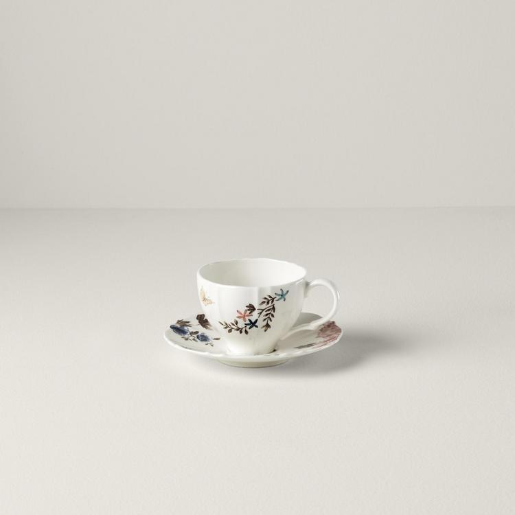 The Sprig & Vine tea cup and saucer is the perfect way to enjoy your morning tea or coffee. This collection brings the beauty and bright colors of a lush English garden to your home. A golden handle adds gleaming touch to give this tea cup its golden finish.