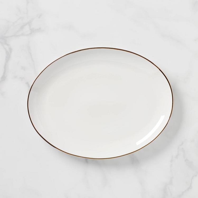 Accented with microwave-safe gold trim, the Trianna Oval Serving Platter boasts a hue. This fashion-forward serving piece is made from dishwasher-safe, durable ceramic porcelain.