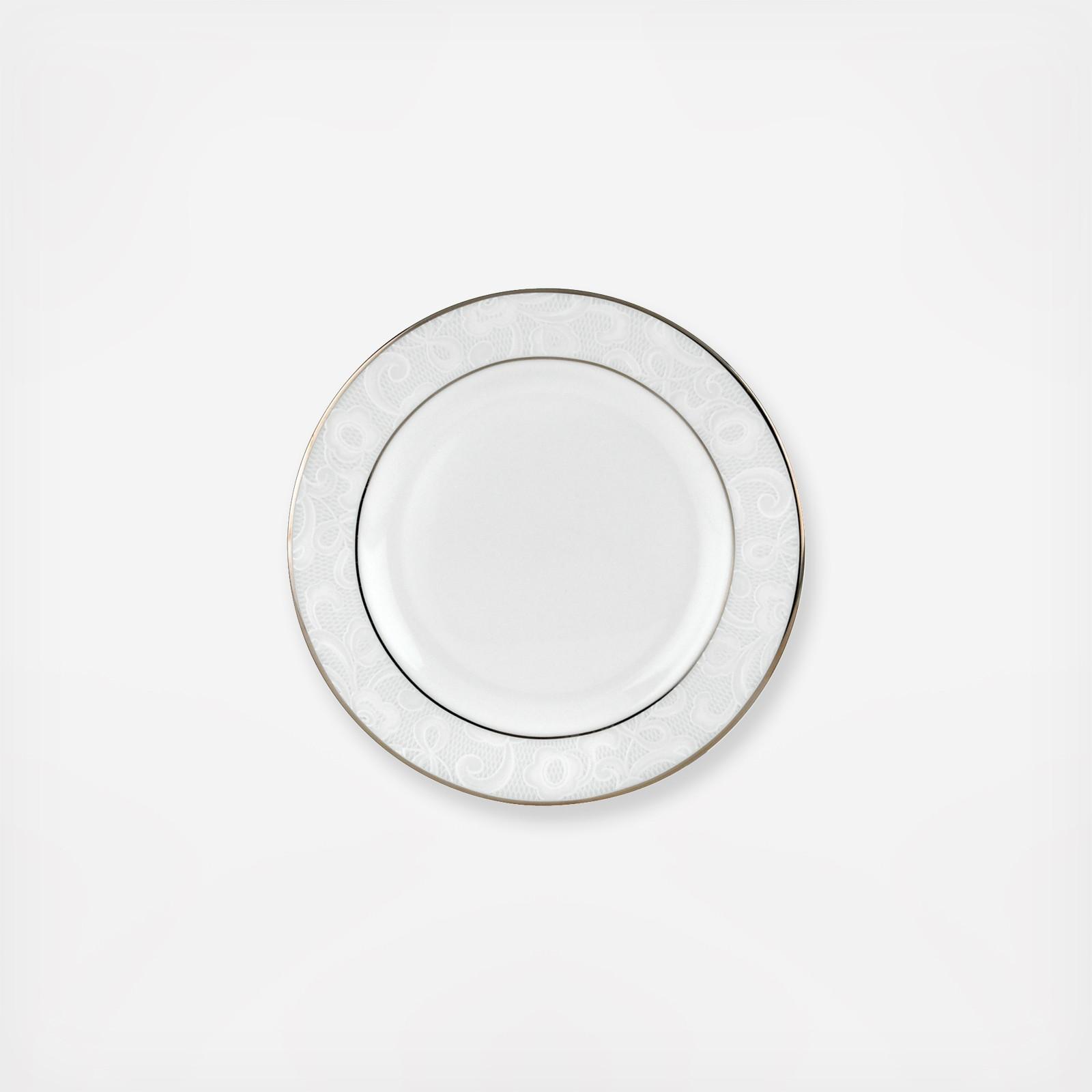 No need to place a doily beneath the butter on this white-bodied china dish. That's because the plate's border already bears a floral motif resembling fine lace netting. Bands of precious platinum provide an elegant finishing touch.