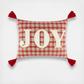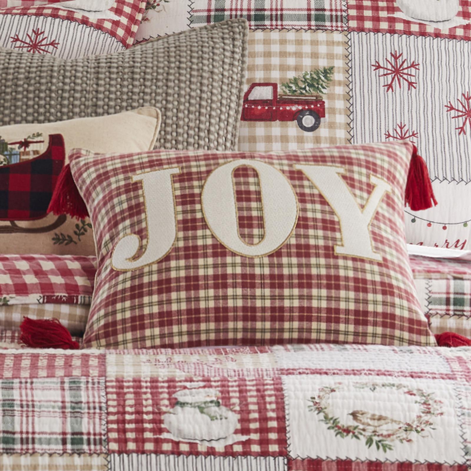 The Joy Plaid decorative pillow matches perfectly with the Home For Christmas bedding collection. This pillow features the word JOY appliqued on a rich Christmas plaid, with red corner tassels. The red, green, taupe and cream color palette makes this a versatile accessory for your bed, couch or favorite chair. The pillow comes pre-filled with a soft, luxurious feather inner.