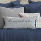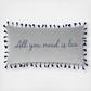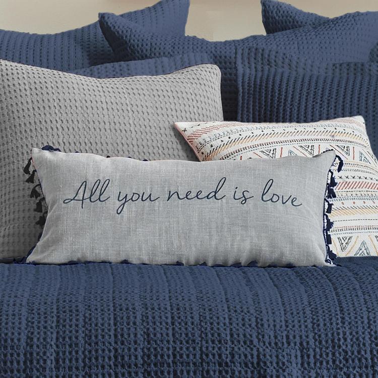 The "All You Need Is Love" Tassels decorative pillow matches perfectly with the Levtex Home Mills bedding collection. This pillow features a beautiful sentiment of "all you need is love" in navy on a grey ground. The navy blue and grey color palette makes this a versatile accessory for your bed, couch or favorite chair. The pillow comes pre-filled with a soft, luxurious feather inner.