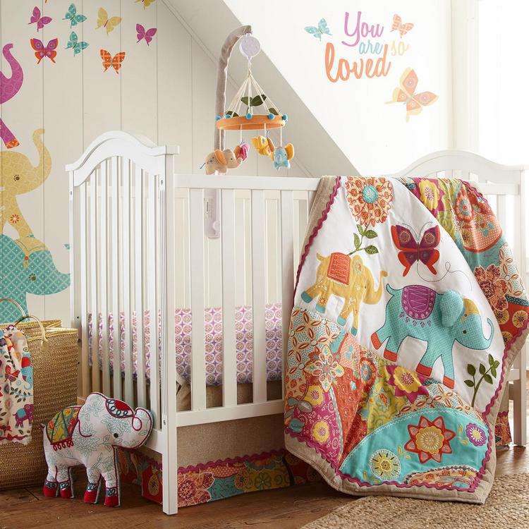 The Levtex Baby Zahara Nursery Collection features globally inspired prints and patterns in a vibrant color-way with accents of a natural shimmering fabric. Whimsical elephants are carried throughout the quilt, diaper stacker and "mural-like" wall decals. The 5 Piece Crib Bedding Set includes a Quilt, 100% Cotton Crib Fitted Sheet, Dust Ruffle, Diaper Stacker and Large Wall Decals to create the perfect "Bohemian" look for your nursery.