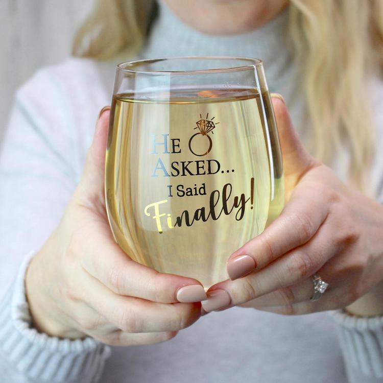 The perfect accessory for the bride-to-be's ring selfie! Announce your engagement and show off your new bling with this stylish glass. Fun for the Bride-to-be or as a thoughtful engagement gift. Either way it’s sure to get you a lot of LIKES! The perfect gift for the bride-to-be, the bride can announce her engagement and show off her ring with this cute “He asked, I said finally” wine glass. Fun for a bridal shower gift or as a thoughtful engagement gift. The glass is 4.75 inches tall and can hold up to 18 ounces of liquid.