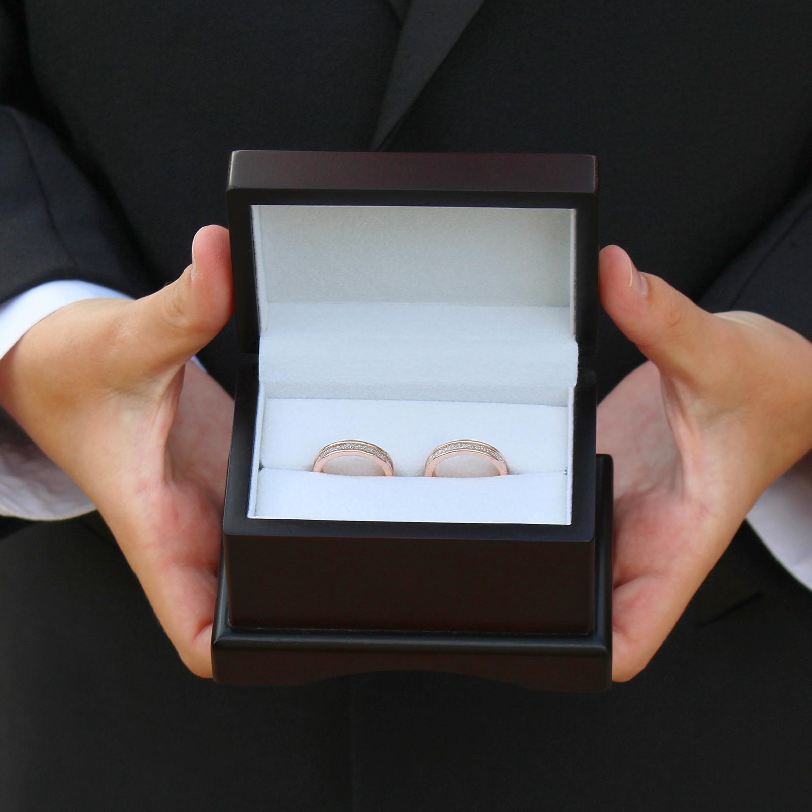 Any ring bearer will proudly carry this ring box down the aisle. This gorgeous dark stained chest ring box will add a unique and elegant element to your wedding day. Store the wedding rings in this chest style ring bearer box to use on the wedding day and use it as a keepsake thereafter.