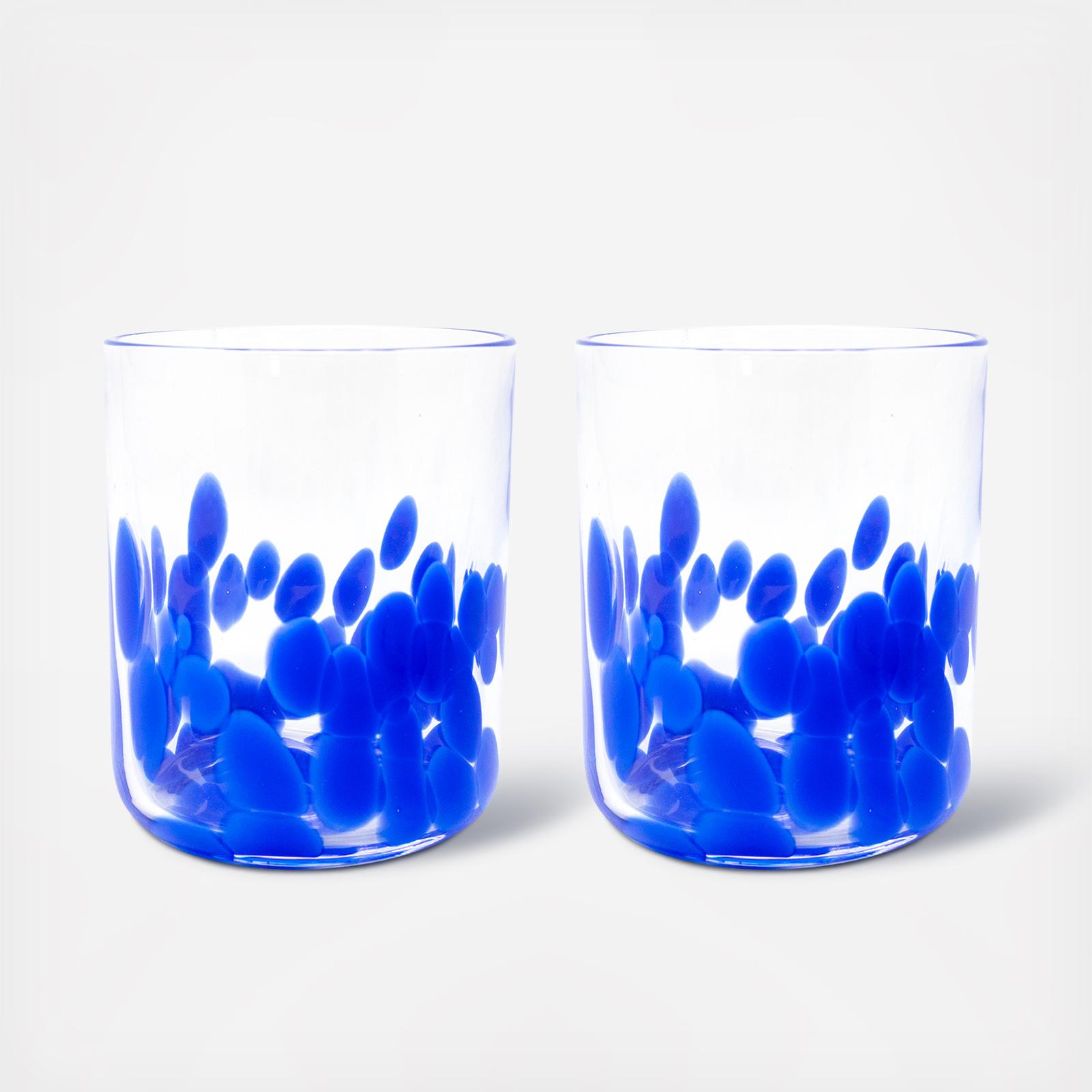 Sip in style with this set of two lowball glasses with vibrant blue details. Packaged in a decorative paper-wrapped box, this drinking glass set makes for a beautiful gift or addition to your bar cart.