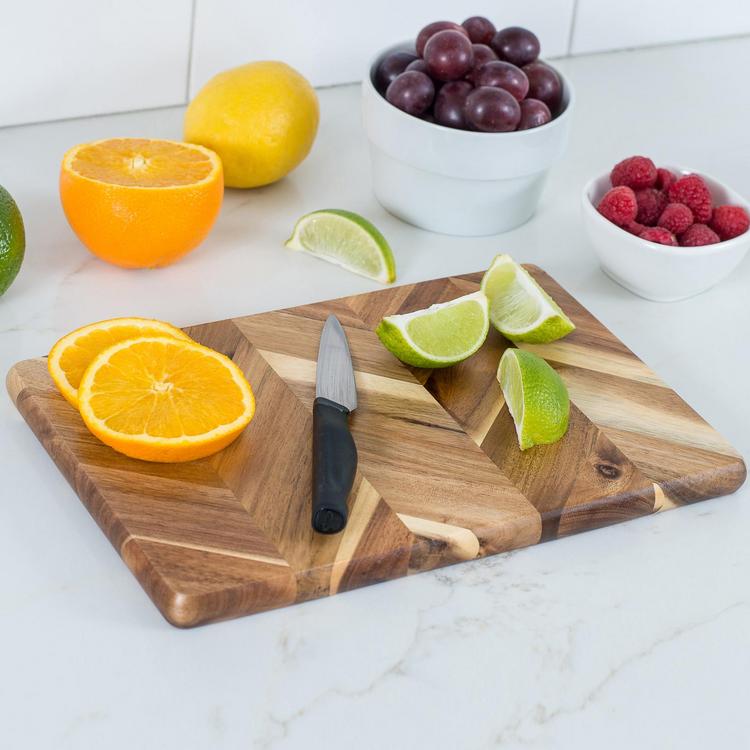 An acacia board featuring a herringbone pattern is as functional as it is beautiful. Acacia wood is naturally dense and resistant to moisture, making it ideal for food contact and long-term use. The standout herringbone pattern isn't just visually striking it showcases the careful craftsmanship and natural grain variation of the wood, turning a simple utility piece into a decorative accent. Whether used as a serving board for cheeses and charcuterie or a small cutting board for daily prep, this piece blends timeless design with eco-friendly durability. Sustainably Beautiful: Made from acacia wood, known for its rich tones and eco-friendly sourcing.